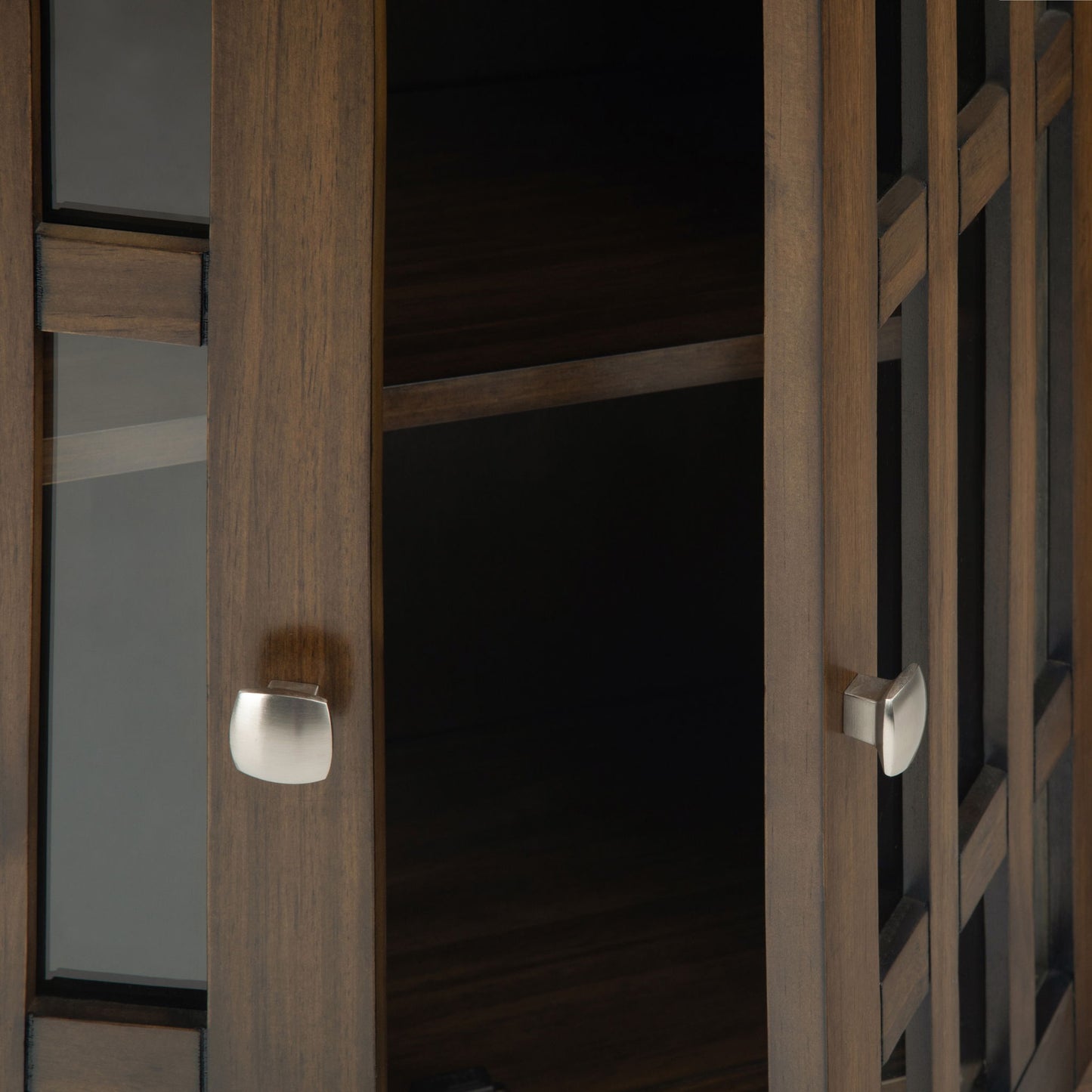 - Transitional design includes molded table top, square and slightly tapered legs, tempered glass doors with cross hatch style mullions and brushed nickel knobs