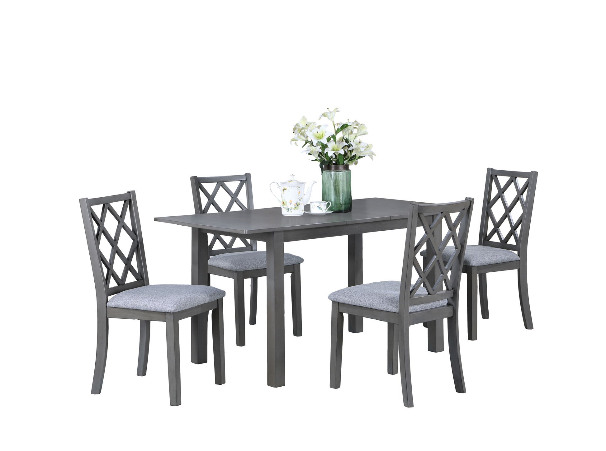 - This beautifully crafted Carlisle 5-Piece Dining Set includes 1 extendable table and 4 matching dining chairs, all designed to provide both style and comfort to your dining room. The Carlisle dining set boasts a sophisticated and modern design with its sleek gray finish. Its clean lines and contemporary aesthetic make it a versatile addition to any home decor. The dining table comes with an innovative extendable feature, allowing you more spacious and comfortable seating. Each dining chair is equipped with an upholstered seat cushion that provides exceptional comfort during meals. The compact design of this 5-piece dining set is ideal for smaller dining areas or apartments. It maximizes your dining space without sacrificing style. Bring the Carlisle set into your dining space today!