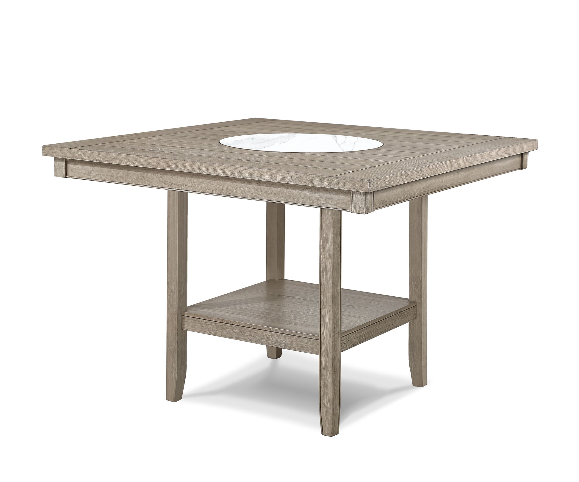 Elevate your dining experience with this elegant counter height dining set, designed to blend seamlessly with any modern or rustic décor. The set features a spacious, finely crafted table with a built-in faux marble turntable and open lower shelf in a weathered white oak finish, exuding a timeless charm that enhances the warmth and appeal of your dining area. Complementing the table are four ergonomically designed chairs and a versatile bench, all upholstered in a soft, neutral fabric that promises comfort and durability. The sturdy wooden frames ensure lasting stability, while the bench adds a unique touch, perfect for family gatherings or casual dinners.