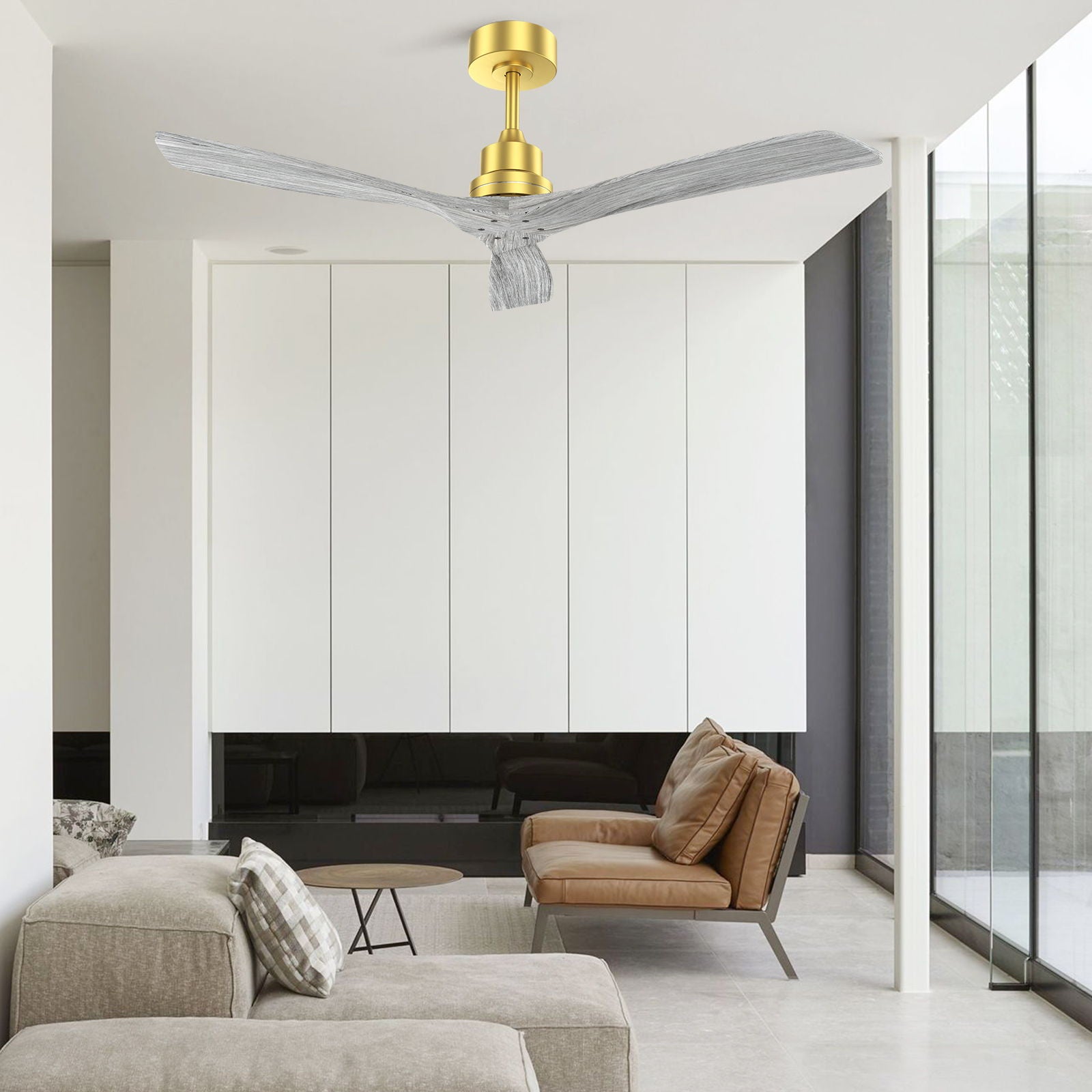 Indoor Ceiling Fan Without Light 3 Solid Wood Blades Remote Control Reversible Dc Motor - Gold