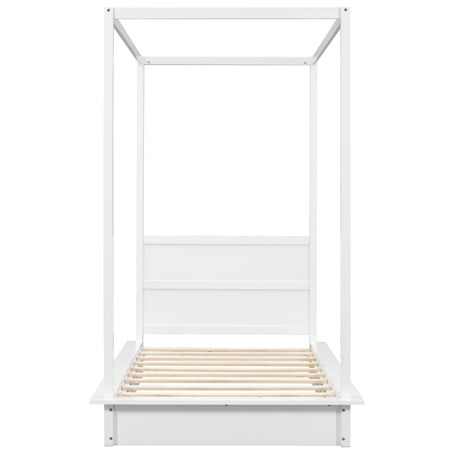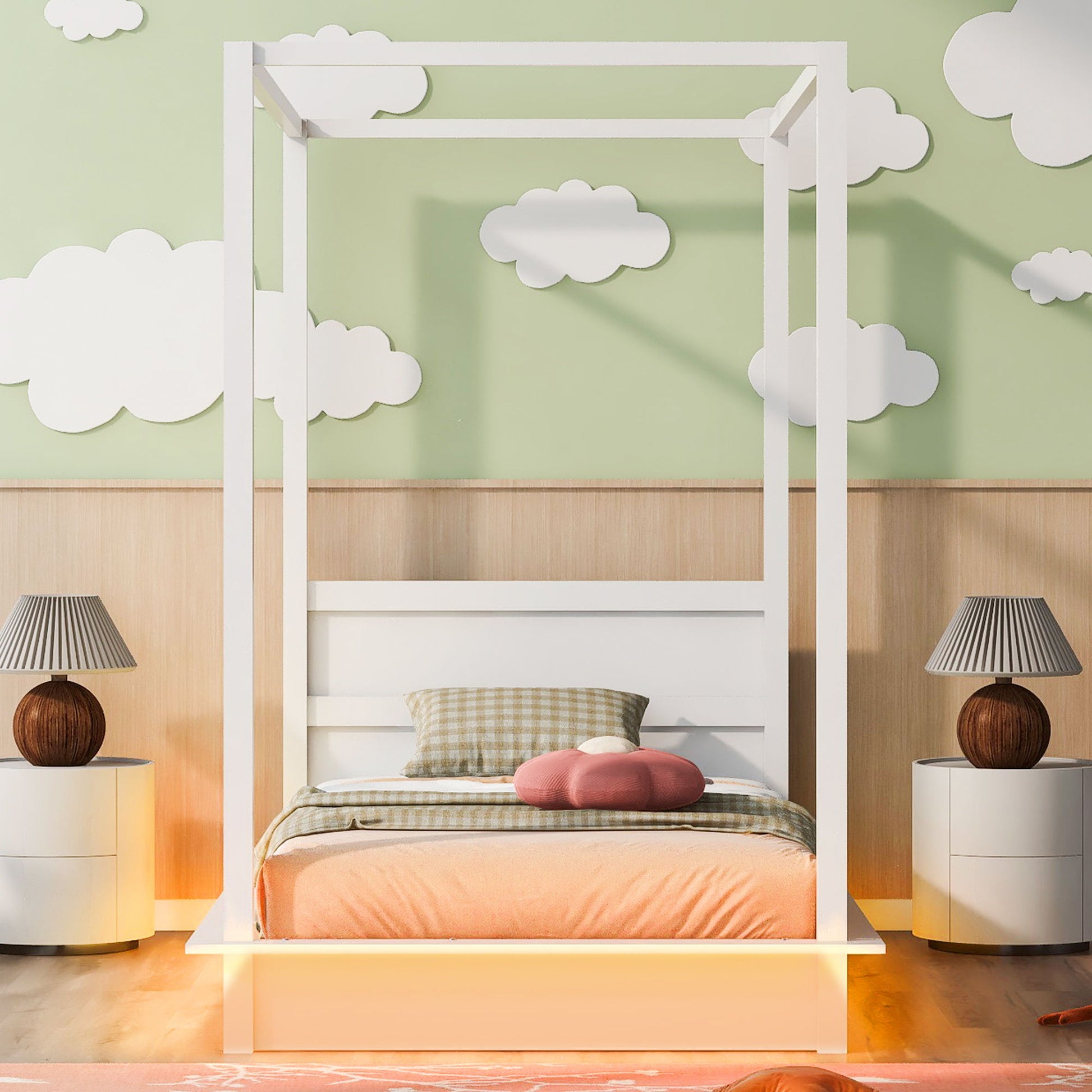 Twin Size LED Canopy Bed, Canopy Platform Bed With Support Slats, No Box Spring Needed - White