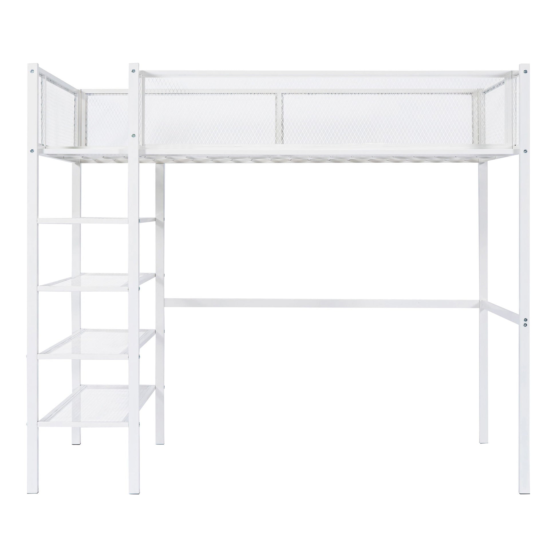 Full Size Loft Bed With 4 Tier Shelves And Storage - White