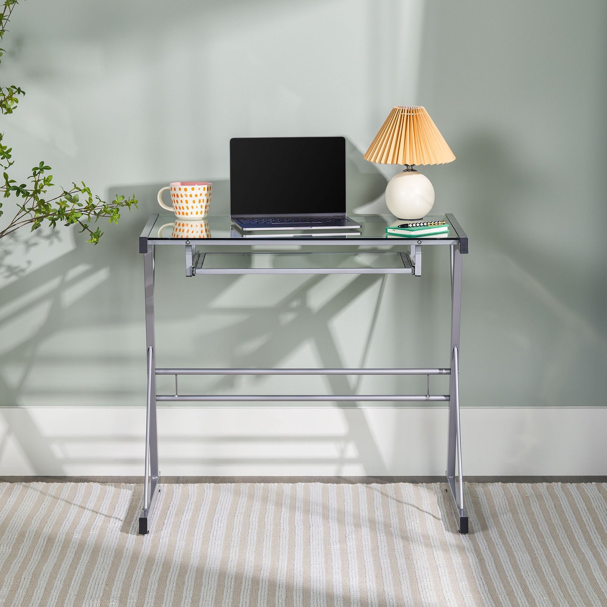 Modern Metal And Glass Computer Desk With Keyboard Tray - Silver