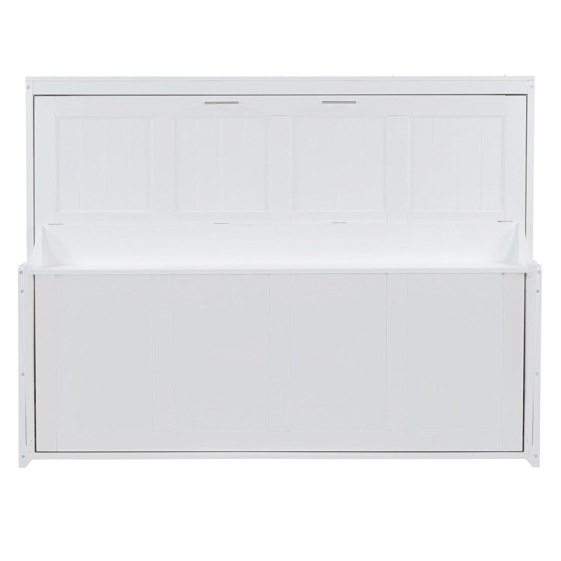 The Wall Murphy Bed is a space-saving solution that combines a bed and desk. With hydraulic hinges, the desk folds away when the bed is pulled down. Available in washed white and washed gray, it fits various décor styles. The sturdy frame supports up to 600 lbs for durability and comfort. A built-in storage space lets you store both the bed and mattress together, keeping your room tidy. Recommended for use with a 10-inch mattress (not included), this Murphy bed is perfect for small spaces.