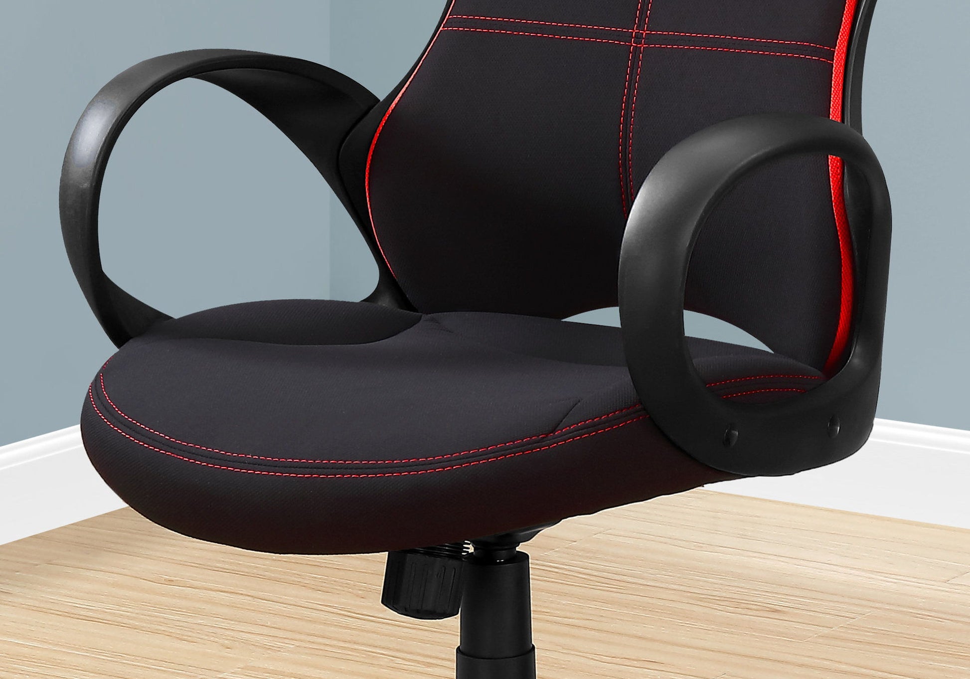 - Design and Material: This gaming-style office chair features a high-back design with fixed, rounded armrests. It is crafted from a polyester-blend fabric in black with striking red accents, providing a modern and contemporary look.