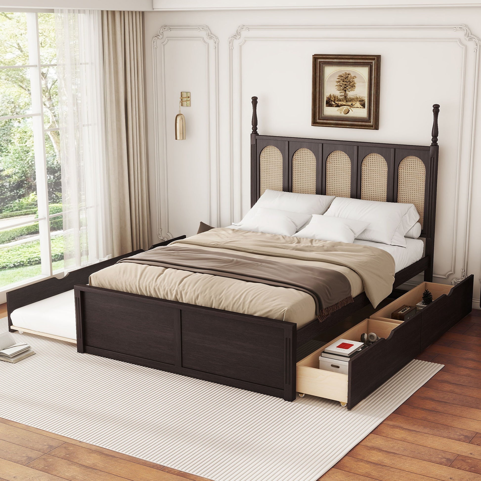 Queen Size Platform Bed With With 2 Big Drawers Twin Size Trundle - Espresso