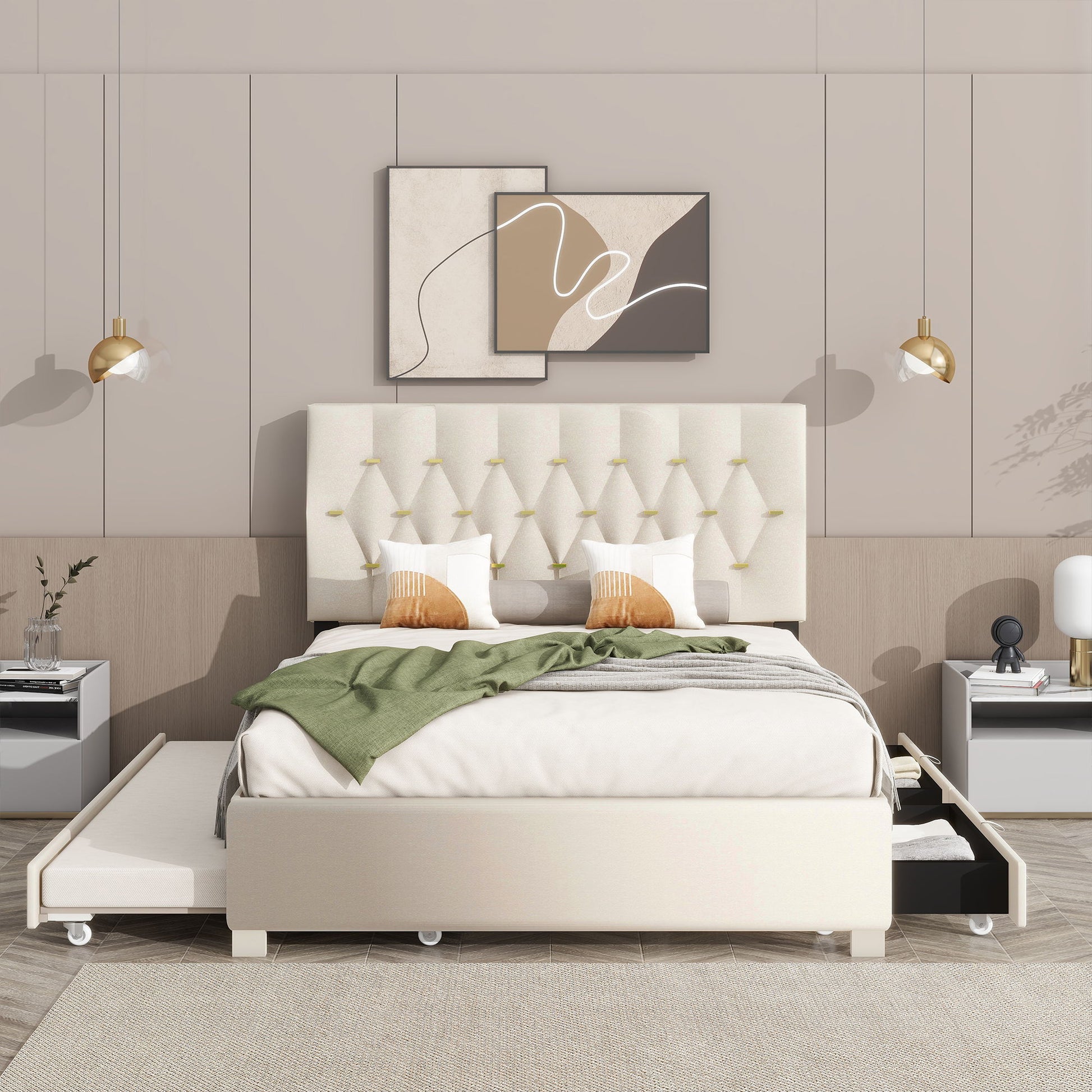 Queen Bed With Pull Out Trundle & Storage Drawers, No Box Spring Required, Space Saving Design - Beige