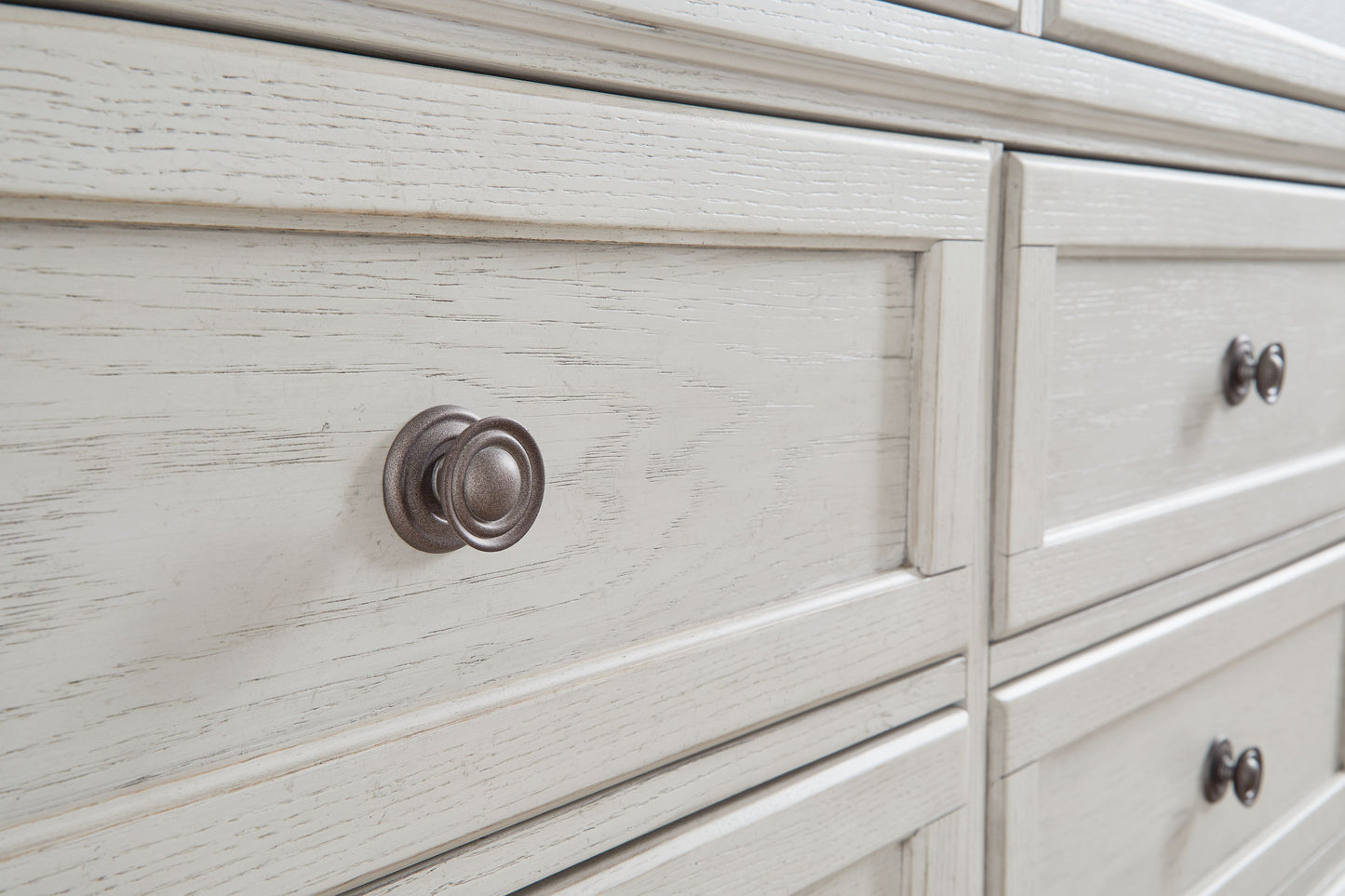 Elegant, timeless furnishings take your bedroom to the next level. Nothing does that better than this dresser and mirror. The antiqued white finish with a wonderful grain texture radiates sophistication, while dark bronze-tone knobs add an ornate touch. Felt finishing in the upper drawers rounds out this tasteful set.