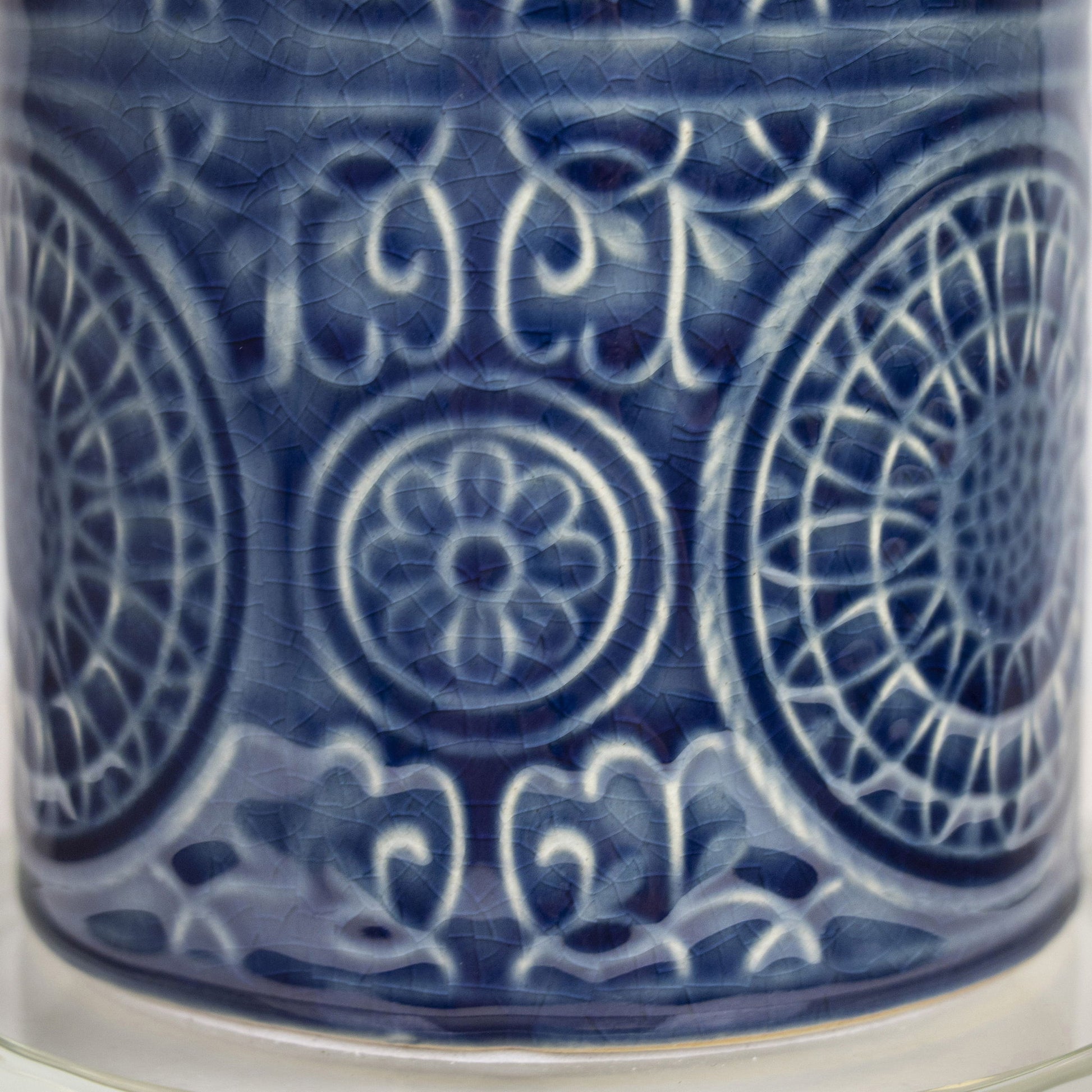 - Stylish Design: The Spyro Table Lamp features a unique cylindrical ceramic body with an embossed design, complemented by a genuine crystal base. Its contemporary style adds an eye-catching element to any room, whether it's a bedroom, living room, or office.