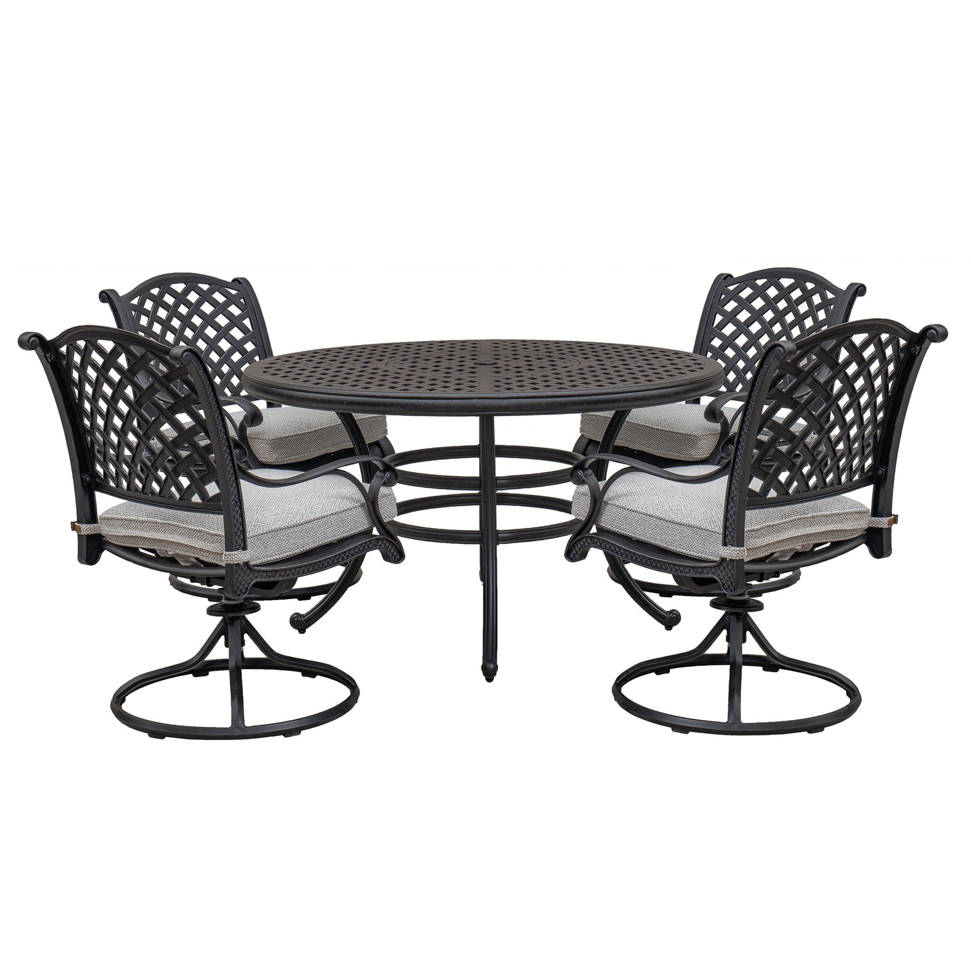 - 5-Piece Dining Set: Versatile set with four swivel chairs and a round table. Features a 2-inch umbrella hole for shade. Ideal for outdoor gatherings and patio dining.