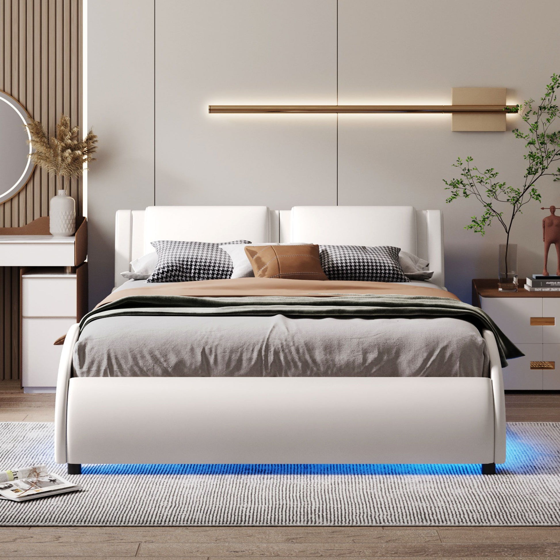 Full Size Upholstered Platform Bed With LED Light Frame With Slatted - White