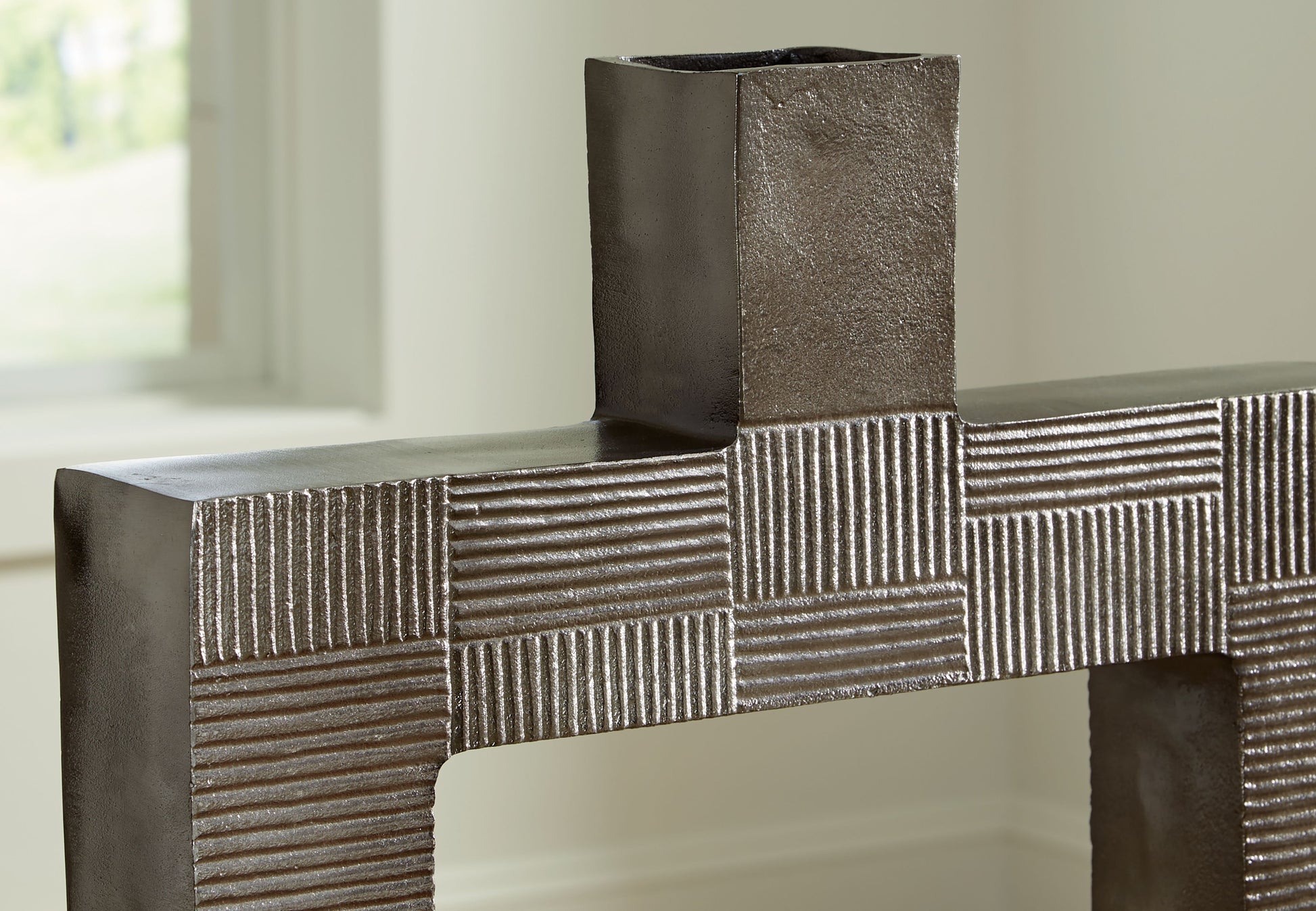 Stunning from all angles, this vase's contemporary geometric form acts as a captivating focal point for your mantle or bookshelf. Its antiqued nickel-tone body is detailed with subtle texture for added visual appeal. What a perfect fit for those seeking forward-thinking style.